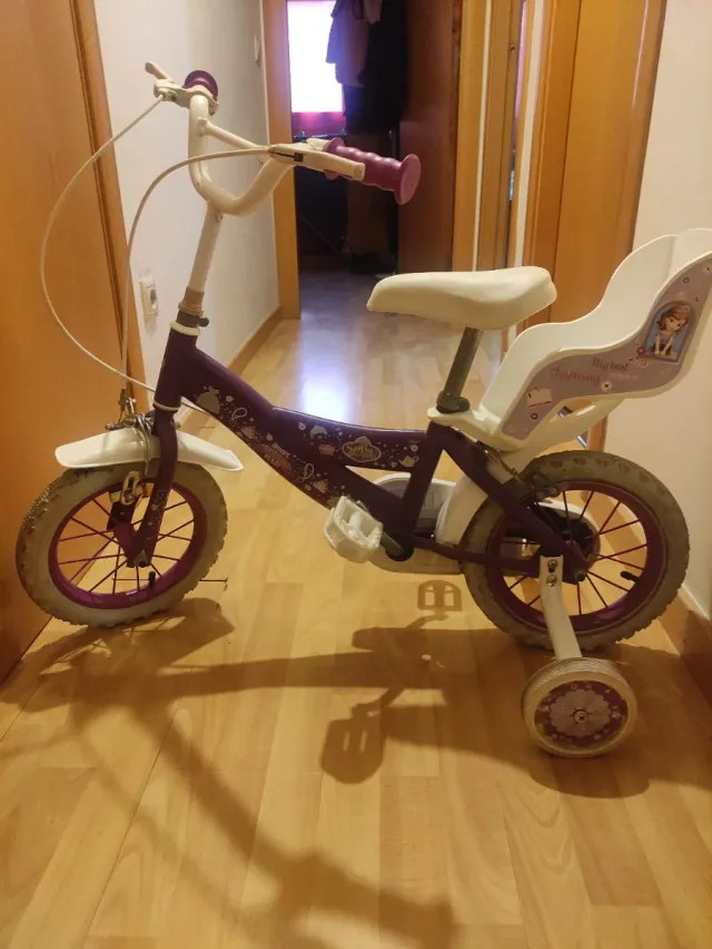 Detalles del productoBicicleta infantil de color morado, ideal para las primeras aventuras sobre ruedas. Cuenta con un asiento trasero para llevar a un amigo o muñeco.