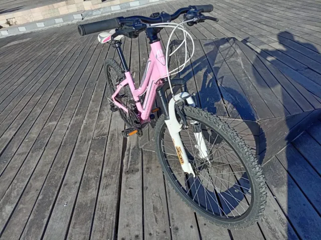 Bicicleta infantil de color rosa. - Cuadro de bicicleta. - Ruedas de bicicleta. - Manillar de bicicleta. - Sillín de bicicleta. - Pedales de bicicleta.