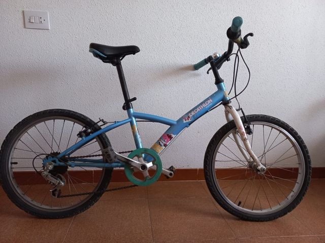 Bicicleta infantil Decathlon en buen estado. Ideal para niñas. - Marca: Decathlon - Tamaño de rueda: 20 pulgadas - Color azul claro - Tiene algunos signos de uso.