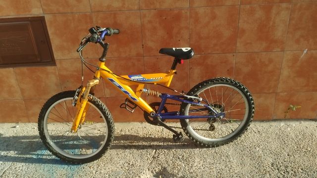 Bicicleta de montaña para niños, en buen estado. - Modelo Down Hill. - Color amarillo y azul. - Suspensión delantera.