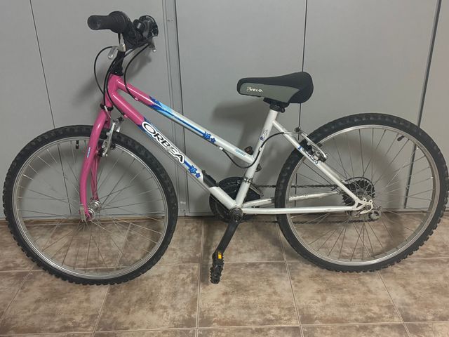 Bicicleta Orbea en color rosa y blanco, ideal para jóvenes ciclistas. - Cuadro de aluminio ligero. - Ruedas de 24 pulgadas. - Frenos V-brake. - Sillín Velo.