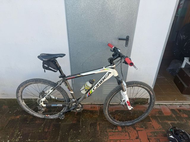 Detalles del productoBicicleta de montaña Orbea de color blanco con detalles de colores.