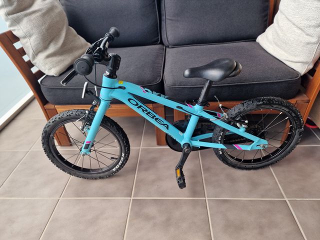 Detalles del productoBicicleta infantil Orbea MX 16 en color azul claro. Tiene un diseño muy bonito y deportivo. Es válido para niñ@s entre 3 y 6 años. Está en muy buen estado. Apenas tiene signos de uso. Todo funciona correctamente y las cubiertas están con poco uso. Y las zapatas de freno están como casi el primer día