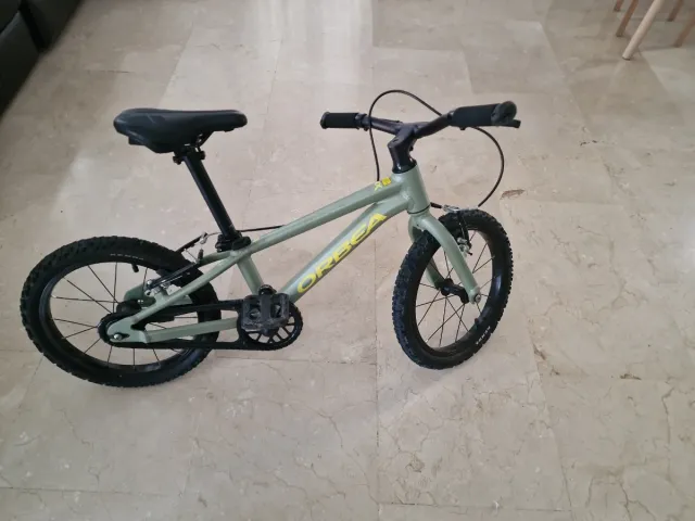 Detalles del productoBicicleta Orbea MX16 en color verde oliva, ideal para niños pequeños.