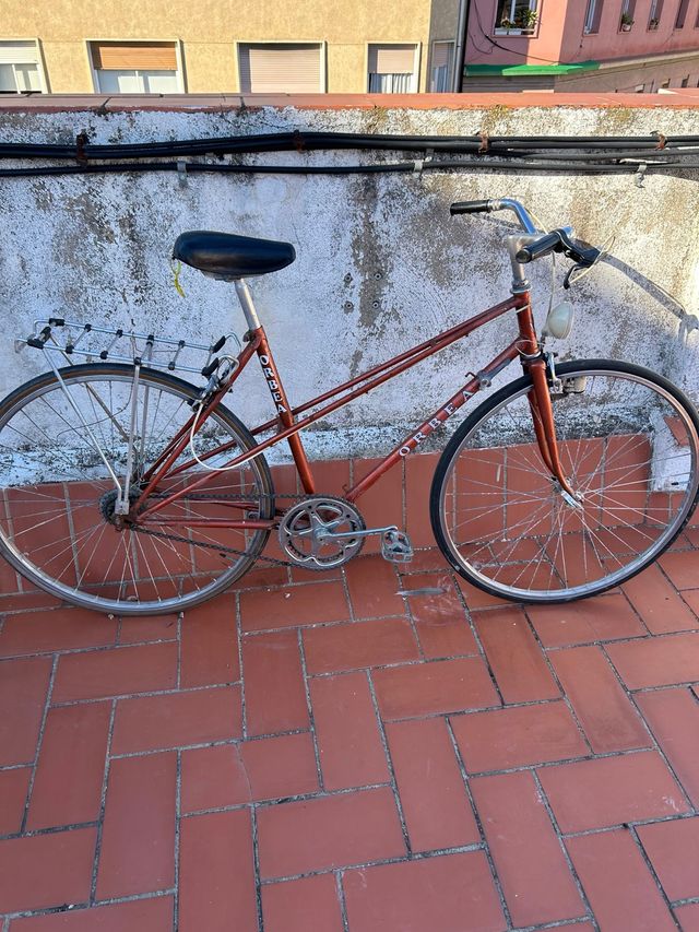 Bicicleta de paseo Orbea de color cobre. - Cuadro de acero. - Rueda trasera con portabultos. - Sillín negro. - Guardabarros delantero y trasero.