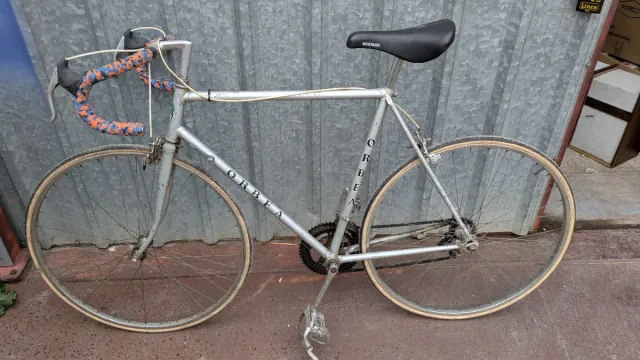 Bicicleta de carretera Orbea de color plateado. - Cuadro de metal. - Manillar con cinta naranja y azul. - Sillín negro Mustang.
