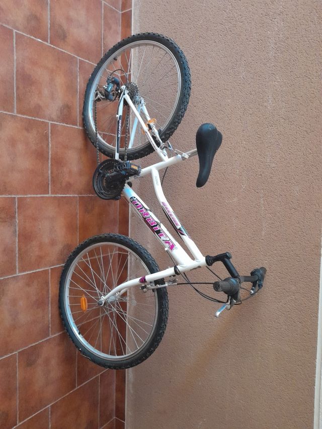 Bicicleta mediana para niño/a marca órbita. Color blanco, gris, negro y rosa. Las marchas de los platos y los piñones están bien conservadas, al igual que los frenos.