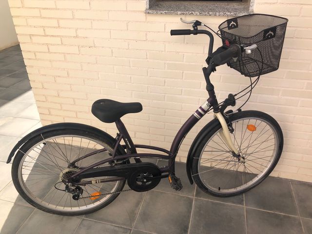 Bicicleta B'Twin Elops 3 en perfecto estado, ideal para paseos urbanos. - Modelo: Elops 3 de B'Twin. - Color morado oscuro. - Incluye cesta delantera.
