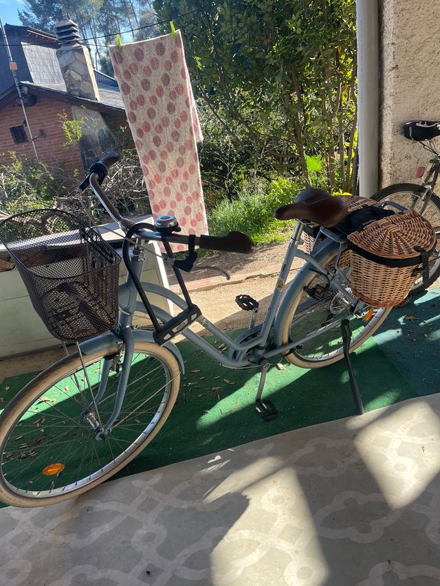 Detalles del productovendo bicicleta paseo talla M-L de color azul. tiene pie para dejarla apoyada, dinamo (luz delantera por friccion de ruedas) y alforjas de mimbre.