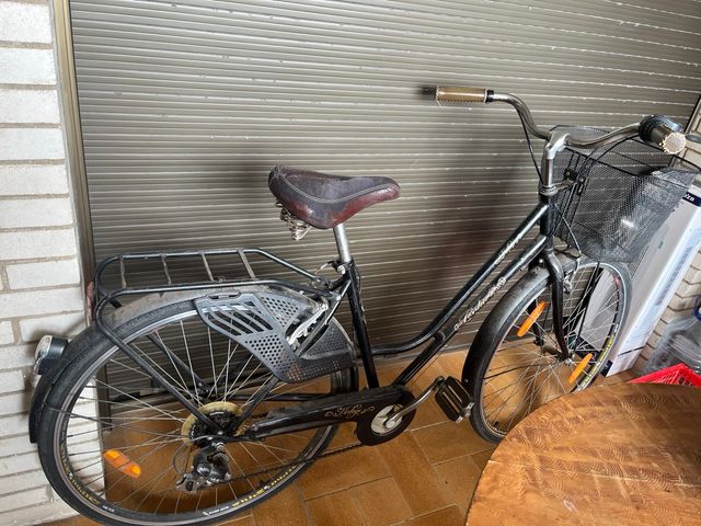 Bicicleta de paseo en color negro, ideal para desplazamientos urbanos. Funciona pero necesita restauración por uso y exposición solar directa.