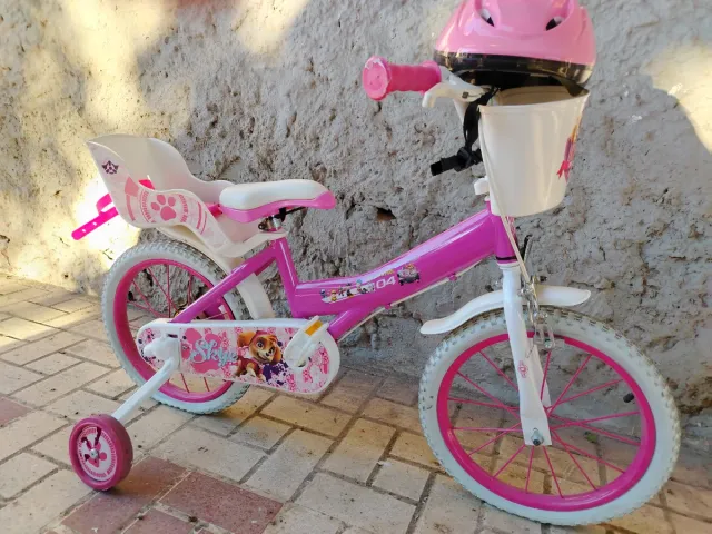 Detalles del productoBicicleta infantil de color rosa con temática de la Patrulla Canina.