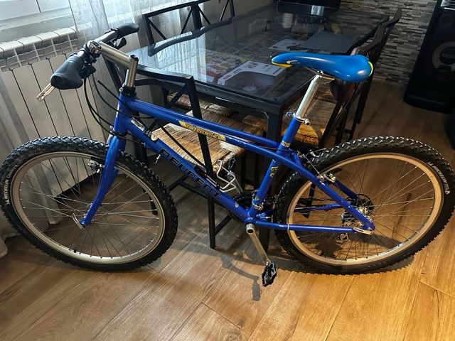 Bicicleta Peugeot Origin de color azul. Un modelo clásico para disfrutar del ciclismo. - Cuadro de aluminio. - Ruedas Michelin Country M. - Sillín azul y amarillo.