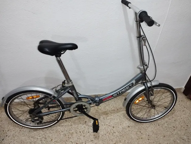 Detalles del productoBicicleta plegable de aluminio seminueva, neumáticos y cambios nuevos. marca Street en color gris. Ideal para desplazamientos urbanos y fácil de guardar.