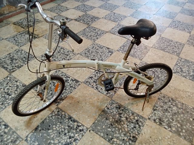 Detalles del productoBicicleta plegable de color blanco con el nombre de la marca Gotty y modelo Freedom.