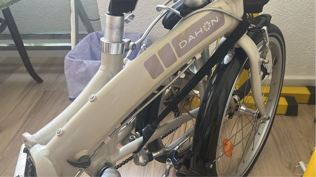 Bicicleta plegable DAHON, ideal para desplazamientos urbanos y fácil de almacenar. - Color beige. - Diseño compacto. - Ruedas de 20 pulgadas.