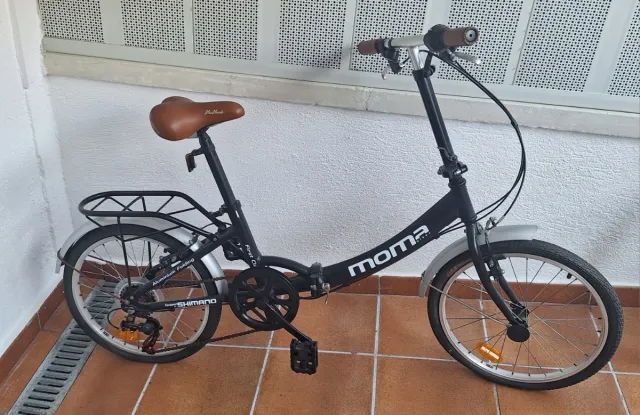 Detalles del productoBicicleta plegable Moma en color negro. Ideal para desplazamientos urbanos y fácil de guardar. El soporte del guardabarros, alguna parte de los piñones y algún detalle más tiene algo de oxido. Se puede ver en la foto. Precio negociable.