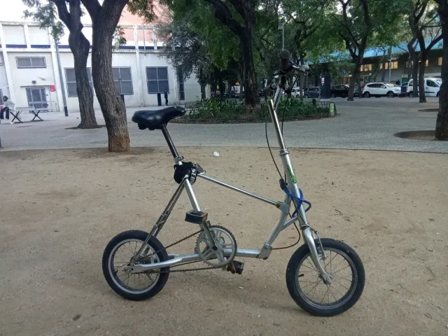 Bicicleta plegable de color plateado, ideal para desplazamientos urbanos. - Ruedas pequeñas para mayor maniobrabilidad. - Sillín negro. - Manillar ajustable.