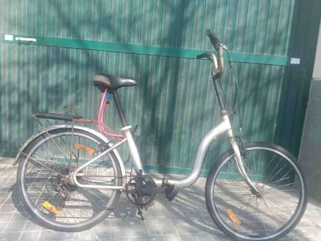 Detalles del productoBicicleta plegable de color plateado, ideal para desplazamientos urbanos.