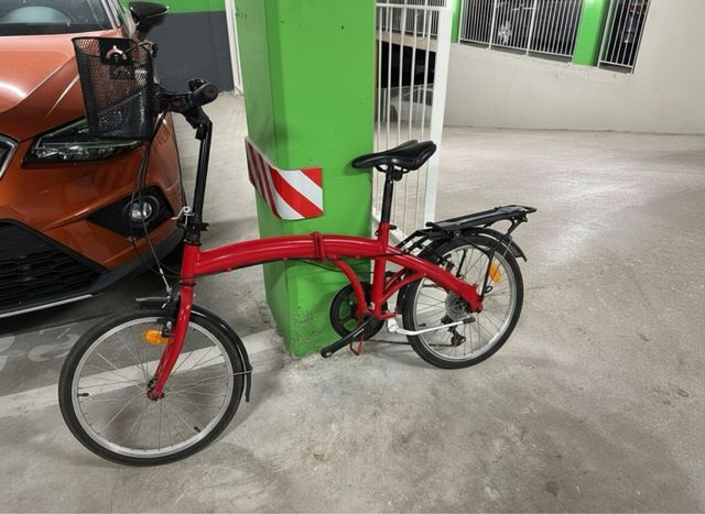 Detalles del productoBicicleta plegable de color rojo, ideal para desplazamientos urbanos o para llevarla contigo a donde vayas.