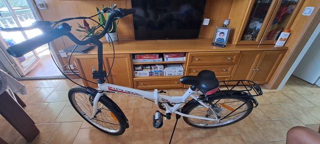 Detalles del productoVendo bicicleta plegable de 24 pulgadas equipada con componentes Shimano de segunda mano, ideal para uso urbano, con cuadro de aluminio ligero y sistema de plegado rápido, aunque presenta algunos desperfectos: la goma del manillar está rota, el timbre falta, la luz trasera está dañada y el asiento tiene arañazos visibles. Incluye cambio Shimano de 6 velocidades, frenos V-Brake de aluminio, ruedas de 24 pulgadas, guardabarros delantero y trasero, y portaequipajes, todo en estado funcional pero usado. Pesa unos 13-15 kg, se pliega a unas dimensiones de 90 x 40 x 70 cm, perfecta para espacio reducido,y transporte publico.