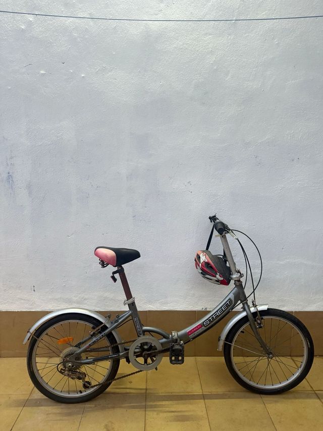 Detalles del productoBicicleta plegable de color gris con detalles en rosa. Ideal para desplazamientos urbanos.