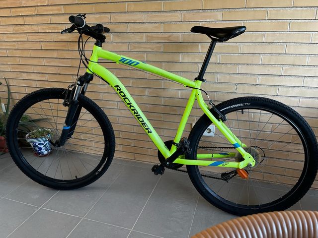 Bicicleta de montaña Rockrider 100 en color verde brillante. - Cuadro de aluminio. - Ruedas de 27.5 pulgadas. - Frenos de disco. - Suspensión delantera.