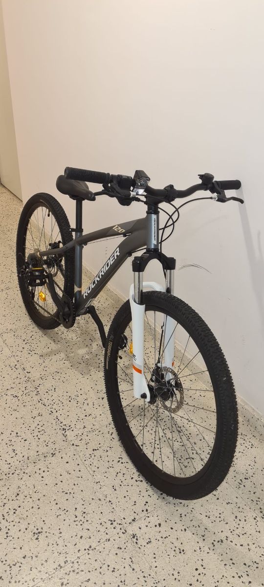 Bicicleta de montaña Rockrider en color gris. - Cuadro de aluminio. - Ruedas de 27,5 pulgadas. - Frenos de disco. - Suspensión delantera.