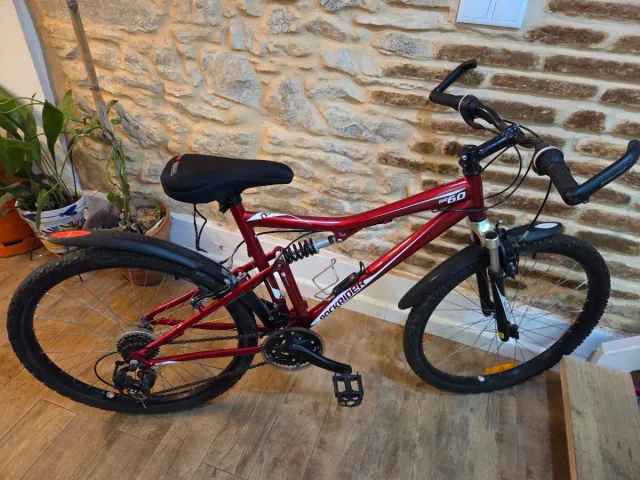 Bicicleta de montaña Rockrider de Decathlon con ruedas de 26 pulgadas. - Cuadro de color rojo. - Suspensión delantera y trasera.