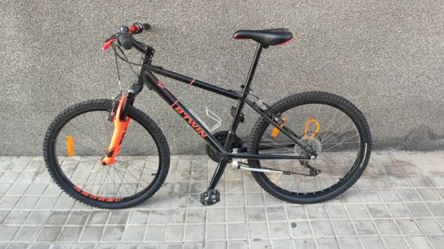 Bicicleta de montaña Rockrider 500 en color negro con detalles en naranja. Rueda trasera nueva. - Suspensión delantera. - Ruedas de 24 pulgadas.