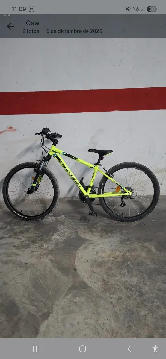 Bicicleta de montaña Rockrider en color amarillo brillante. Ideal para iniciarse en el ciclismo. - Cuadro de aluminio. - Suspensión delantera. - Frenos de disco. - 24"