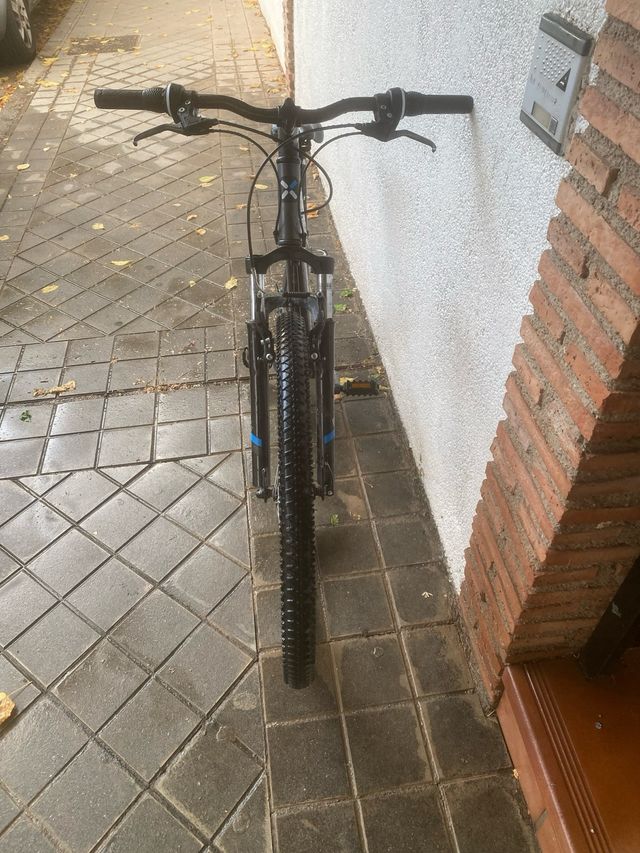 Bicicleta Rockrider en color azul y negro. - Cuadro de aluminio. - Ruedas del veintisiente y medio - Frenos de zapata - Suspensión delantera.