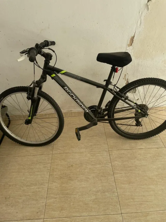 Bicicleta de montaña Rockrider en color negro con detalles en verde y gris.