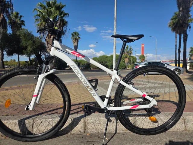 Bicicleta de montaña Rockrider ST 100 en color blanco. - Cuadro de aluminio. - Ruedas de 27.5 pulgadas. - Frenos de disco. - Suspensión delantera.