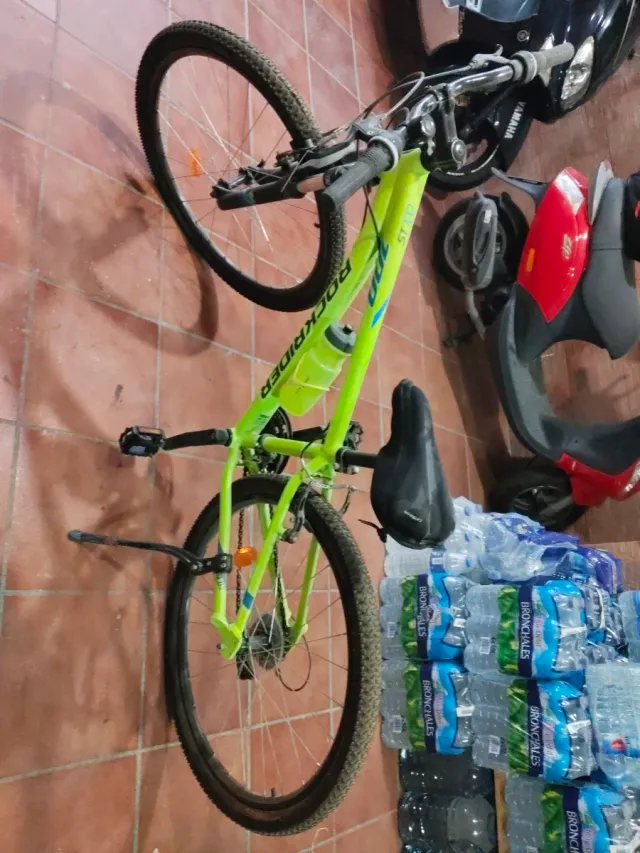 Detalles del productoBicicleta de montaña Rockrider ST 100 en color verde lima.casi nueva la usé 3 veces , doy casco , tiene pata y termo para el agua