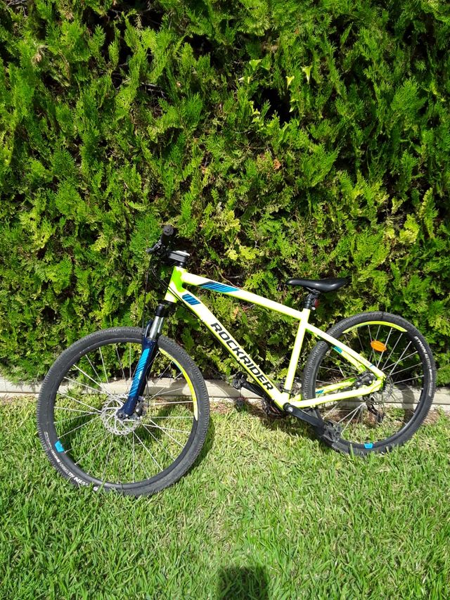 Detalles del productoBicicleta de montaña Rockrider en color amarillo brillante. Perfecta para disfrutar de rutas y senderos.