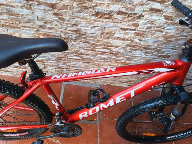 Bicicleta Romet modelo Rambler con ruedas de 26 pulgadas. - Cuadro de aluminio. - Color rojo brillante. - Frenos de disco. - Suspensión delantera.
