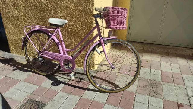 Bicicleta de paseo en color rosa, con cesta delantera. - Cesta de mimbre rosa. - Sillín blanco. - Guardabarros delantero y trasero.