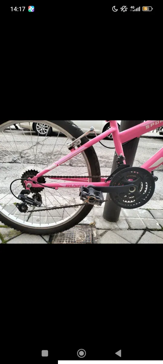 Bicicleta de la marca RUNFIT en color rosa. - Cuadro de bicicleta. - Rueda trasera. - Cadena. - Pedales. - Frenos.