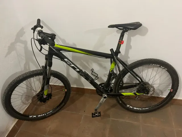 Bicicleta de montaña Scott con cuadro negro y detalles en verde lima. Para altura de 1'70 a 1'80