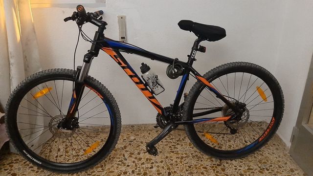 Bicicleta Scott de montaña con cuadro negro, naranja y azul. Incluye portabidón. - Ruedas Kenda. - Frenos de disco. - Suspensión delantera.