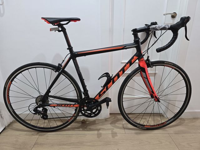 Detalles del productoBicicleta de carretera Scott Speedster en color negro y naranja. Ideal para entrenamientos y rutas.