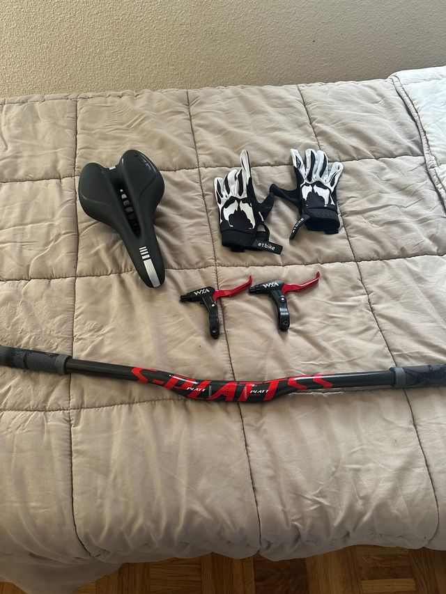 Conjunto de accesorios para bicicleta. - Sillín negro. - Guantes de ciclismo. - Frenos rojos. - Manillar de carbono.