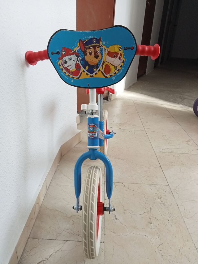 Bicicleta de aprendizaje con diseño de Paw Patrol. - Manillar con agarres rojos. - Ruedas blancas con aro rojo. - Decoración de Chase, Marshall y Rubble.