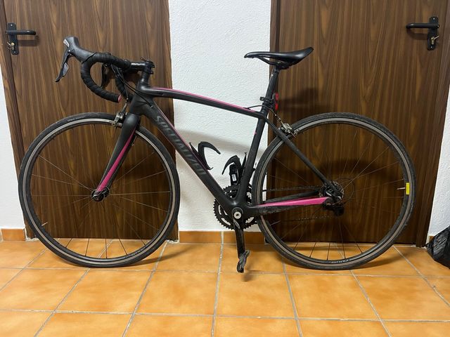 Bicicleta de carretera Specialized Amira. Talla 51 - Cuadro de carbono. - Shimano 105 - Color negro con detalles en rosa. - Ruedas Mavic.