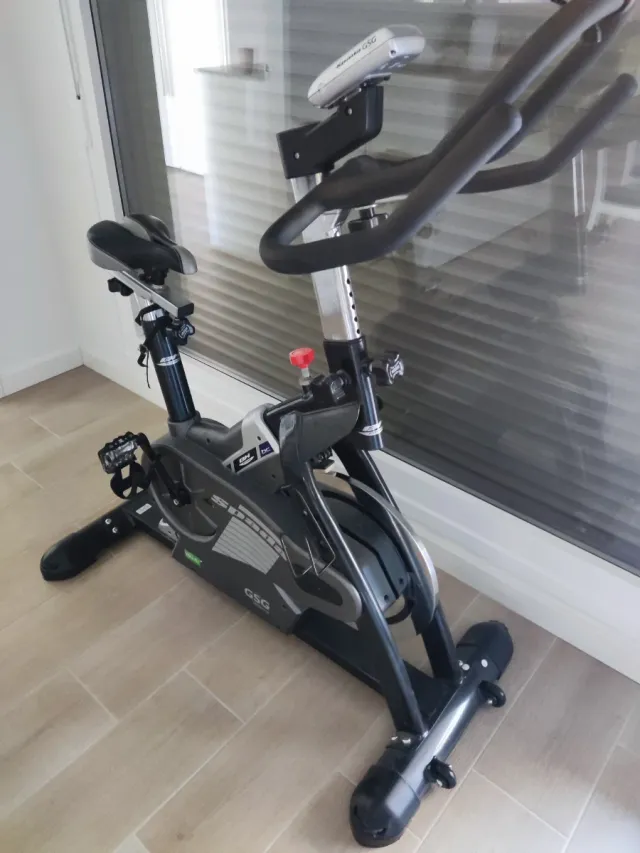 Bicicleta de spinning de la marca BH, modelo GSG. Diseñada para entrenamientos en casa. - Color gris y negro. - Sillín ajustable. - Manillar ergonómico.