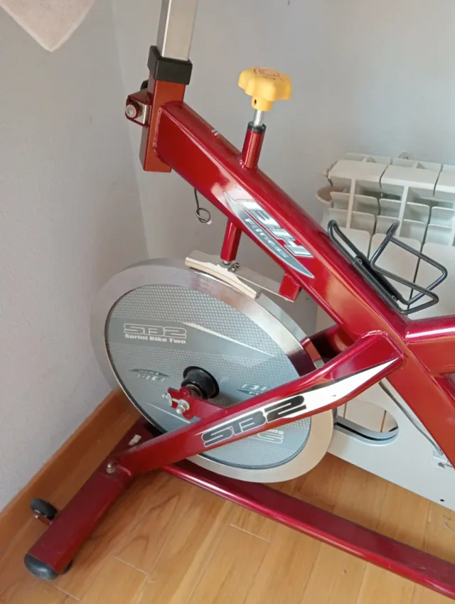 Bicicleta de spinning de la marca BH, modelo SB2. - Color rojo brillante. - Volante de inercia plateado con detalles. - Ajuste de resistencia con pomo amarillo.