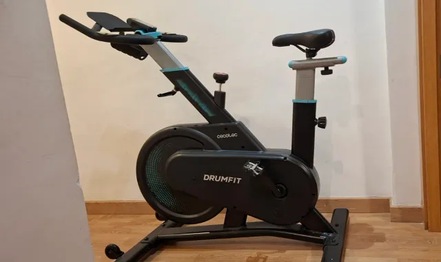 Detalles del productoBicicleta de spinning Cecotec Drumfit 7000 en color negro y detalles en verde-azul.