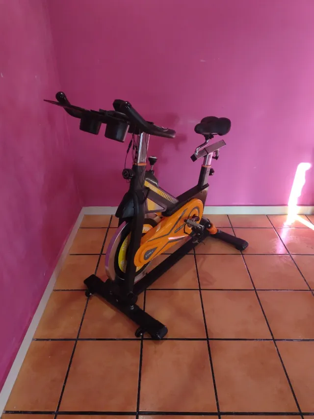 Detalles del productoBicicleta de spinning con un diseño moderno en colores naranja y negro. Ideal para entrenamientos cardiovasculares en casa.