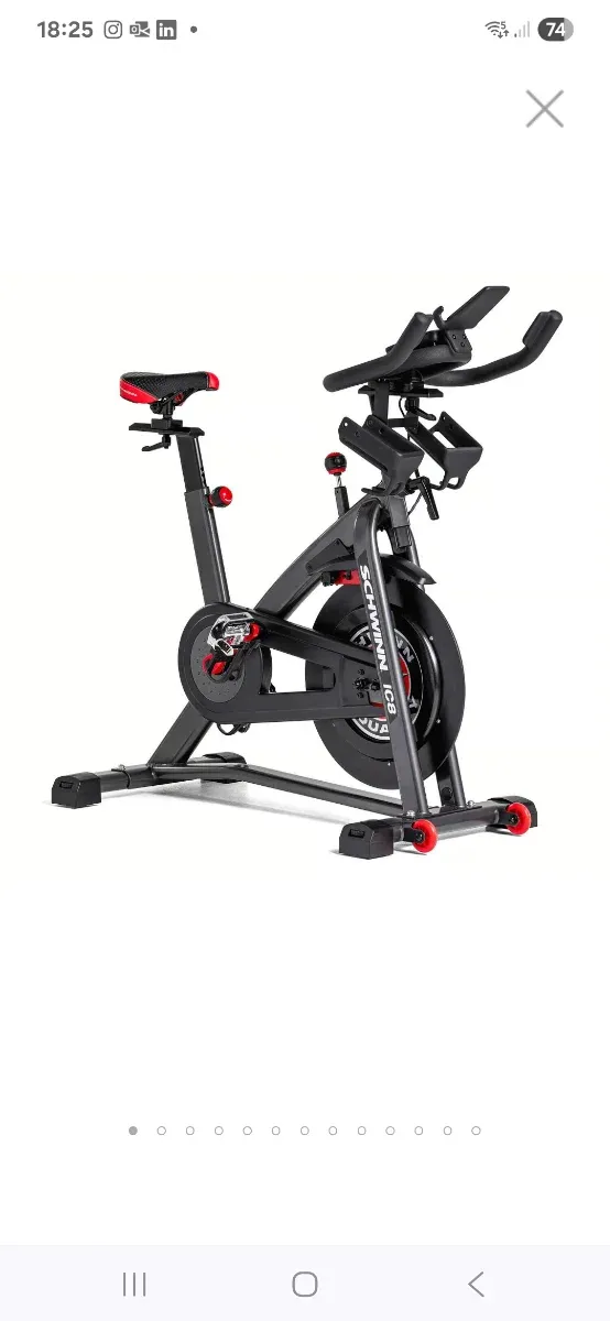 Bicicleta de spinning de la marca Schwinn, modelo IC8. Diseñada para entrenamientos intensos en casa. Rueda de inercia de gran tamaño con freno magnetico.
