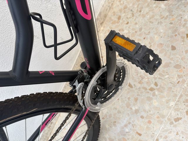 Bicicleta en color negro con detalles en rosa, talla L. - Cuadro de aluminio. - Ruedas de 26 pulgadas. - Frenos de disco. - Cambio Shimano.